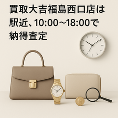 金・プラチナ、ダイヤ・宝石、ブランドバッグ・時計はもちろん、切手・中国切手、テレホンカード、古銭・古紙幣、金券・商品券、美術品・骨董、勲章・軍装品、カメラ・レンズ、楽器まで網羅できると、家の整理が一度で進みます。買取大吉福島西口店は「素材価値」と「製品価値」を分けて説明するスタイルで、付属品や来歴(ギャランティ、鑑定書、箱、購入店・年代)も丁寧にヒアリングします。価値の根拠が言語化されるので納得感が違います。